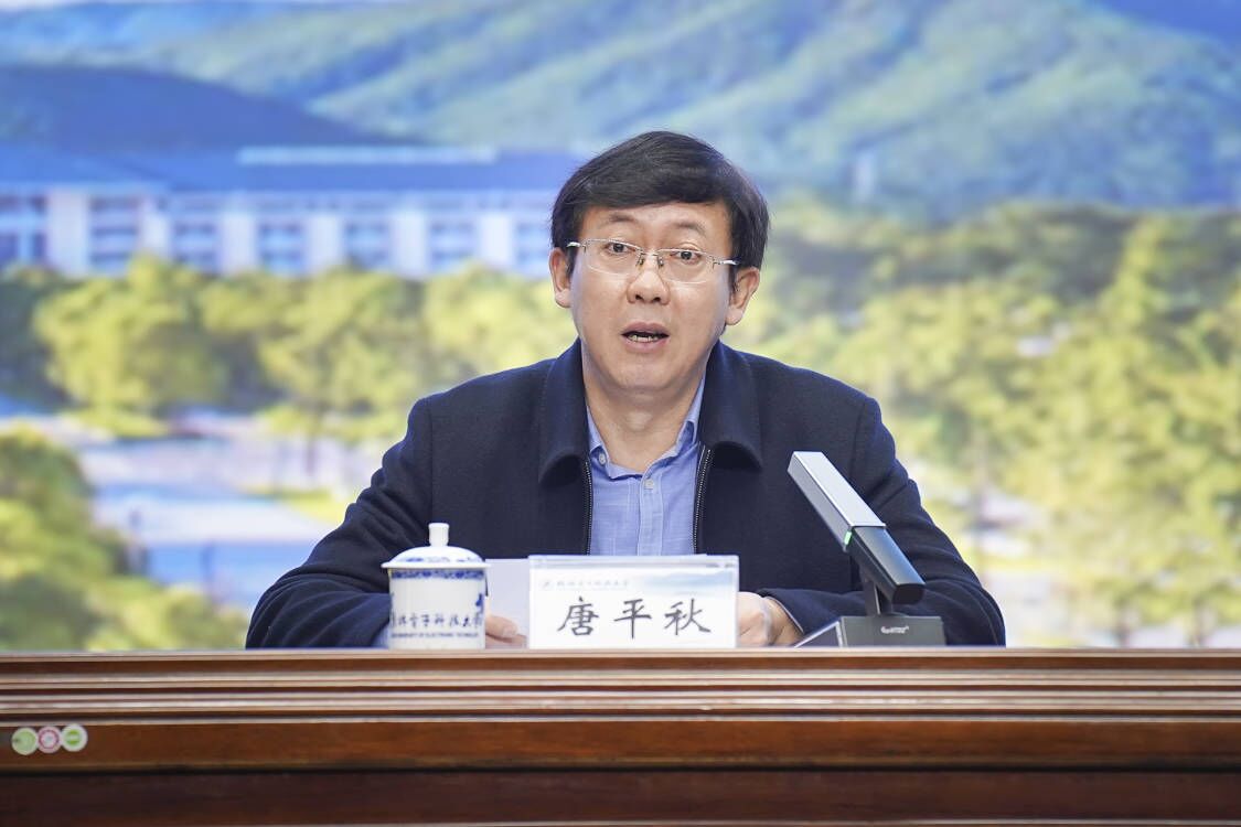 唐平秋在总结讲话中指出,2021年工作成绩来之不易、鼓舞人心,是全校各部门、各单位及全校干部师生积极进取、努力奋斗的结果。他代表学校党委向全体师生员工一年来的辛勤付出和努力拼搏,表示衷心的感谢!