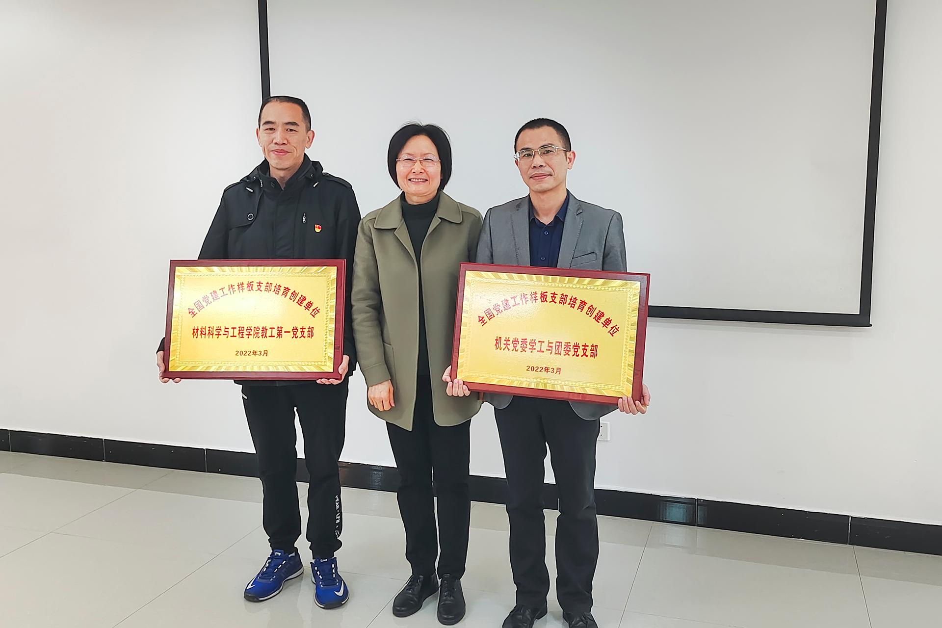 随后,陈贵英为我校获得第三批全国党建工作样板支部培育创建单位授牌,材料科学与工程学院教工第一党支部和机关党委学工与团委党支部负责人参加授牌仪式。外国语学院党委书记杨丹江代表学院党委就党建工作亮点进行了典型案例介绍。