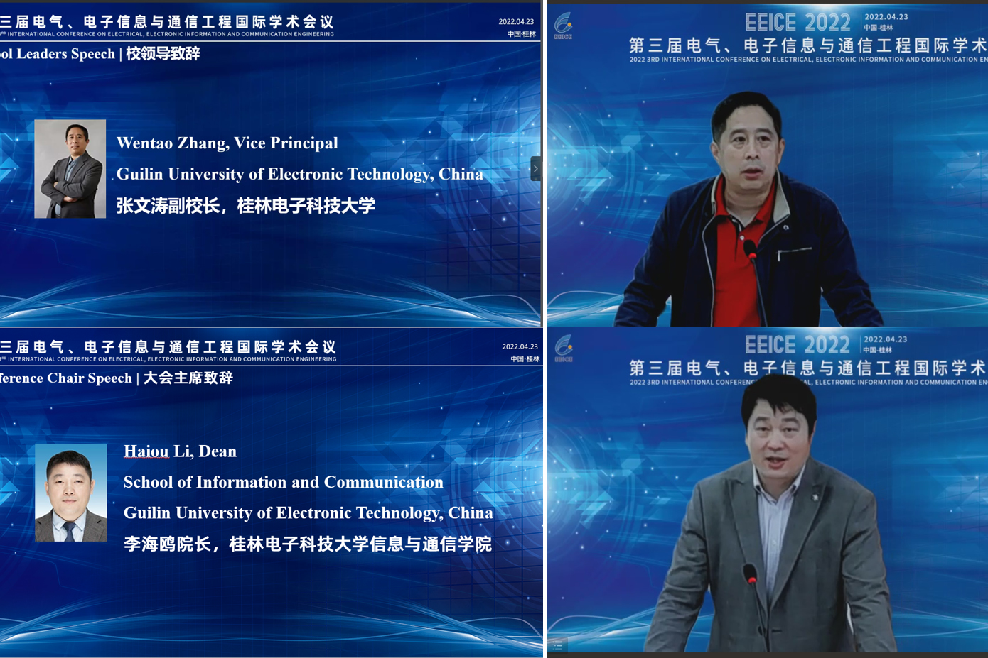 2022年4月23日,第三届电气、电子信息与通信工程国际学术会议 (EEICE 2022)通过线上+线下(桂林电子科技大学分会场)相结合的形式隆重召开。本次会议由桂林电子科技大学和天津大学共同主办,我校信息与通信学院和AEIC学术交流中心承办。我校副校长张文涛、信息与通信学院院长李海鸥、副院长王俊义,以及来自全国多所高校、企事业单位等近400位专家学者参加了会议。