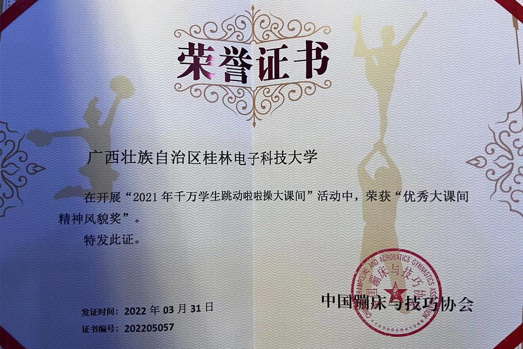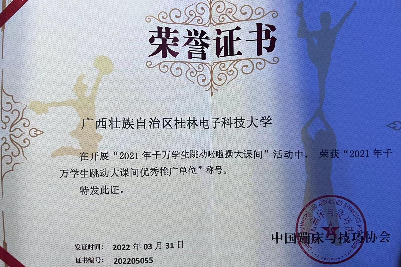近日,由国家体育总局体操运动管理中心主办、全国啦啦操委员会承办的“2021年千万学生跳动啦啦操大课间”活动获奖名单公布,我校在全国选送的队伍中脱颖而出,是广西唯一获得“全国百佳校园大课间优秀单位奖”“优秀大课间精神风貌奖”和“大课间优秀推广单位”三项殊荣的单位。