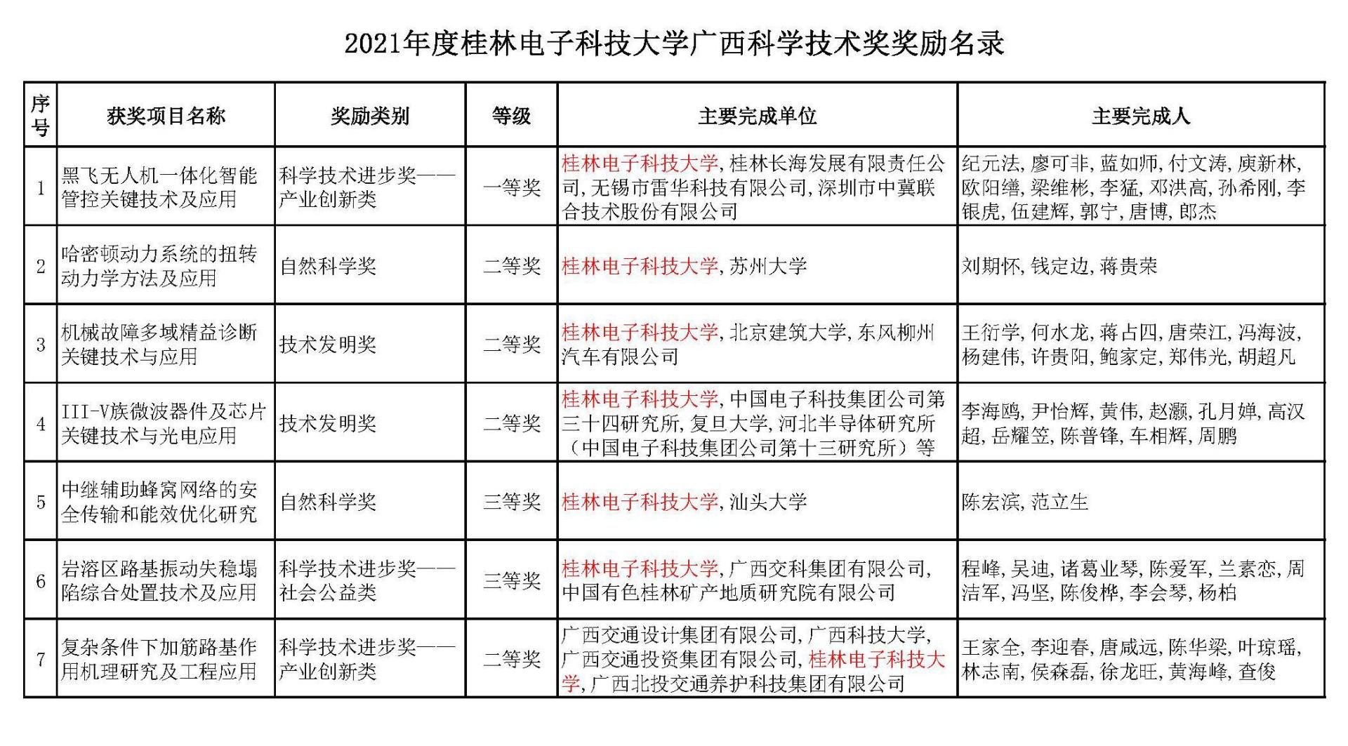 我校2021年度共有7项成果获奖。其中,以第一完成单位获得一等奖1项、二等奖3项、三等奖2项。同时,我校还以参与完成单位获1项二等奖。荣获广西科学技术进步奖一等奖的是纪元法教授主持完成的“黑飞无人机一体化智能管控关键技术及应用”项目,该项目成果应用于低空安防、机场防护、应急管理、军事对抗等多个领域,推广至江苏、广东、浙江等17个省,出口15个国家,经济效益显著。