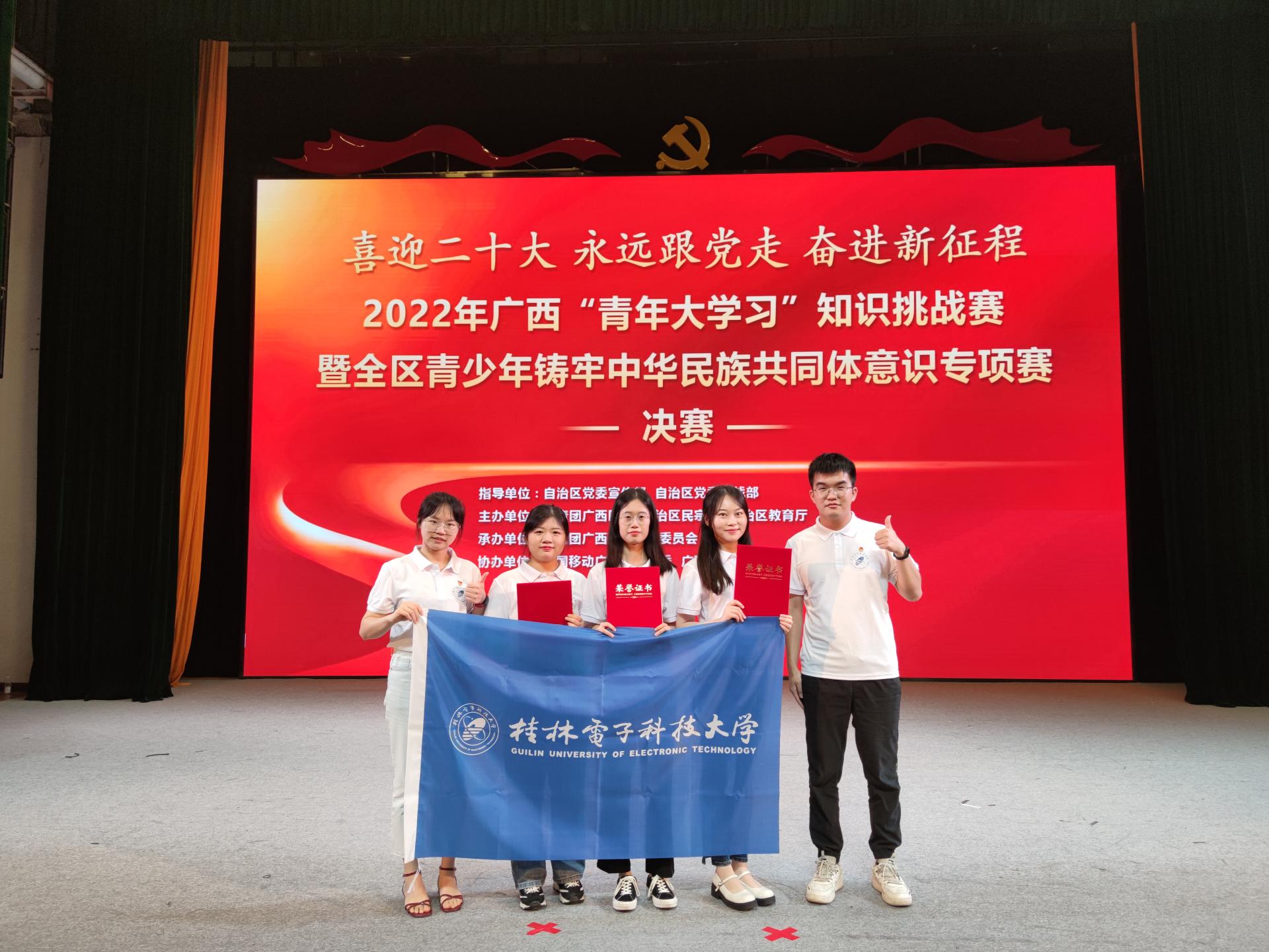 6月12日上午,“喜迎二十大、永远跟党走、奋进新征程”——2022年广西“青年大学习”知识挑战赛暨全区青少年铸牢中华民族共同体意识专项赛决赛在南宁举办。我校马克思主义学院研究生万晋旭、彭仟萍、王岩组成参赛队伍,该参赛队伍于四月中旬开始筹备,历时近两月,经过院赛、校赛、区赛的层层选拔,在全区几十所高校中脱颖而出,以优异成绩入围决赛。在决赛中,经过必答题、抢答题、风险题等环节的激烈角逐,我校参赛队伍在全区75个由地市、系统、和高校组成的队伍中排名第五,荣获全区三等奖的好成绩。