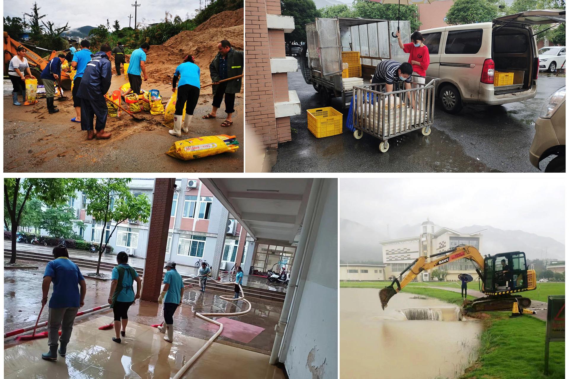 担当作为保障校园安稳。为确保供餐食材及时、保质、保量供应各餐厅,后勤处职工冒着暴雨验收食材;大雨天气师生不便出行就餐,后勤处主动作为,安排职工穿越大雨将饭菜送达B区、C区、F区等学生宿舍餐饮服务点,确保师生安全、便捷就餐。在降雨缓和之际,后勤处及时安排职工开展疏通积水管道和清淤工作,冲洗教学楼内淤泥,工作人员连续奋战,累计疏通堵塞管道300余米,清理沉沙井砂石、淤泥10车,尽量畅通校园道路排水渠道,加速积水排泄,保障师生出行安全。