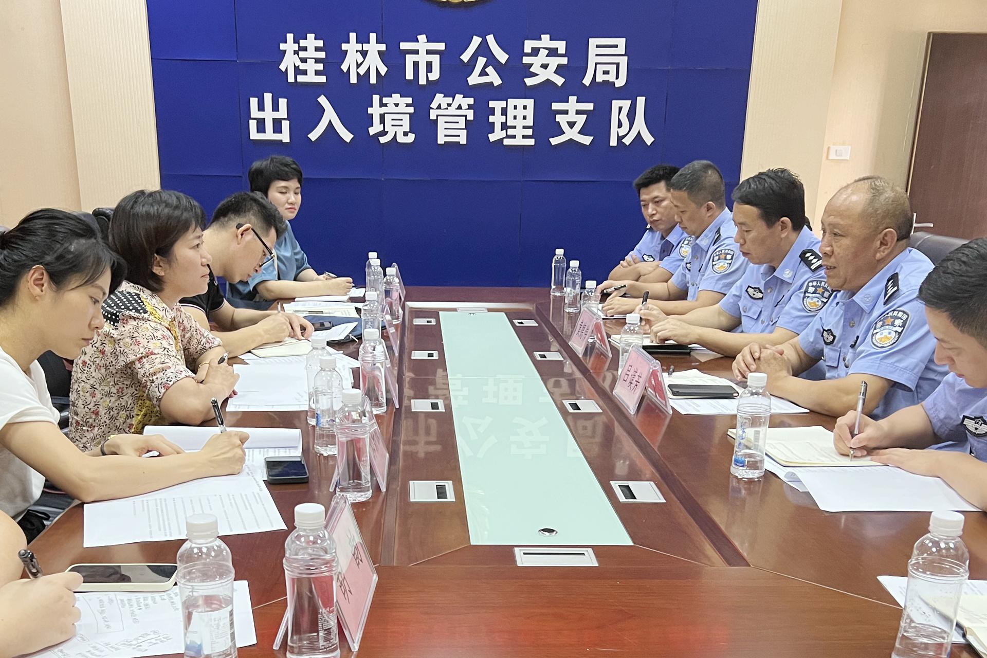 近日,国际学院院长王玥带队赴桂林市公安局出入境管理支队调研交流,桂林市公安局出入境管理支队支队长黄德伟、政委吕谟芳及机动大队、案件调查大队、外管大队相关负责人,学院班子成员及来华留学生辅导员参加座谈交流。
