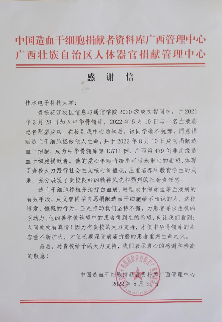 日前,我校信息与通信学院2020级导航工程专业学生成文智在柳州市造血干细胞采集医院成功捐献80毫升造血干细胞混悬液。随后,这份生命的种子被成功移植到一名重症血液病患儿的体内。成文智成为桂林市第51例造血干细胞捐献者。