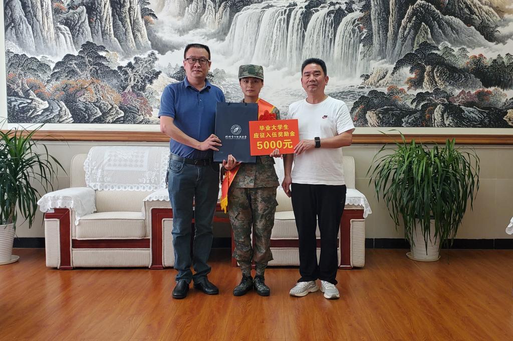 朱小精为欧梦颁发了奖励金并赠送了纪念品,表示学校将认真做好拥军优属工作,积极落实优抚政策,持续为每一位应征入伍大学生及他们的家人提供关心与支持。同时勉励欧梦要遵守纪律、全面学习、锤炼品格,发扬桂电精神,展现桂电担当,实现青春梦想。