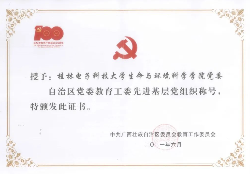 2019-2020年,学院党委连续获校“先进基层党组织”,2021年获自治区党委教育工委“先进基层党组织”。生物医学工程教工党支部获首批全国党建工作样板支部、自治区先进基层党组织,环境工程教工党支部获首批新时代广西高校党建工作样板支部培育创建单位。