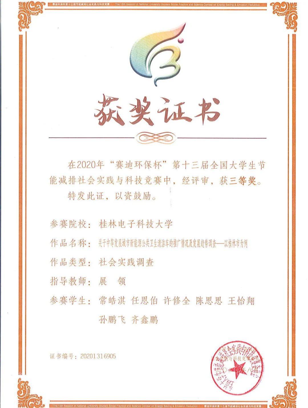 第十三届全国大学生节能减排大赛三等奖