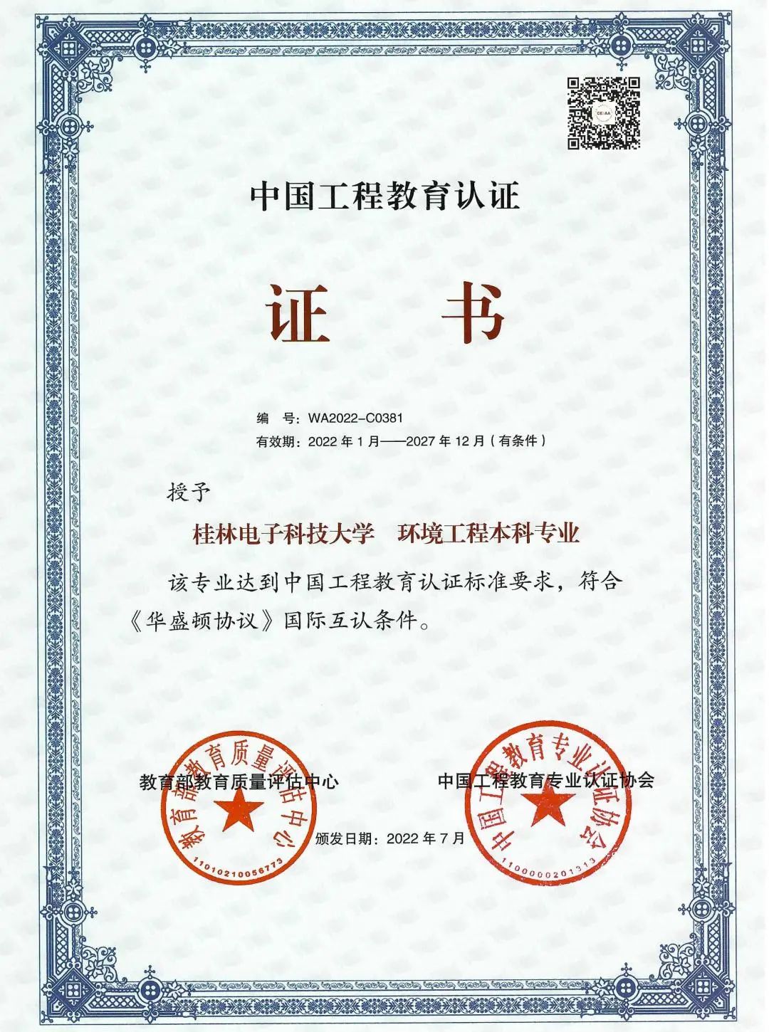 环境工程专业工程教育认证通过证书