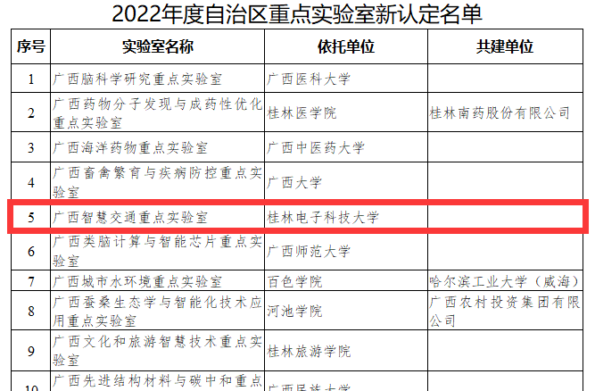 近日,根据自治区科技厅《关于公布2022年度自治区重点实验室新认定名单的通知》(桂科基字〔2022〕60号),我校申报的“广西智慧交通重点实验室”成功获批,成为此次新增认定的18家自治区重点实验室之一,学校再增加一个省级科技创新平台,标志着我校在交通运输工程研究领域科研能力和水平迈上一个新台阶。