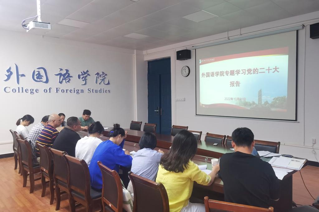 10月21日,外国语学院党委理论学习中心组在花江校区第三教学楼3408会议室召开本年度第五次学习会,专题学习党的二十大报告。会议由学院党委书记杨丹江主持,学院全体党委委员、支部书记参加会议。