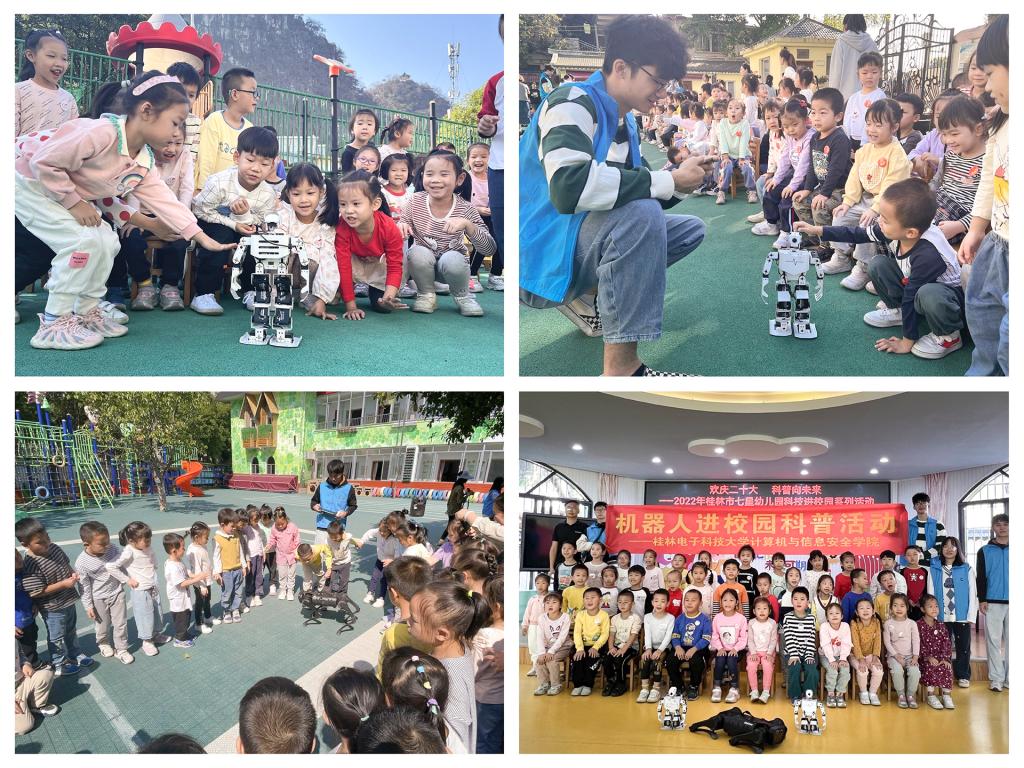 近日,计算机与信息安全学院组织机器人团队成员前往七星幼儿园、高新幼儿园开展“科技进校园”活动。桂林市七星区教育局副局长冯嘉莉、计算机与信息安全学院党委书记文辉及该院2020级辅导员参加了活动。