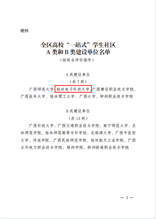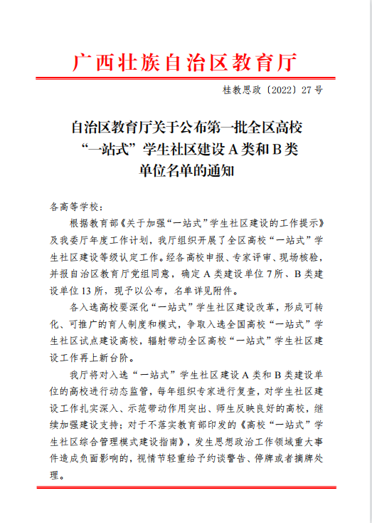 近日,自治区教育厅印发《自治区教育厅关于公布第一批全区高校“一站式”学生社区建设A类和B类单位名单的通知》(桂教思政〔2022〕27号),我校获评第一批全区高校 “一站式”学生社区建设A类单位。