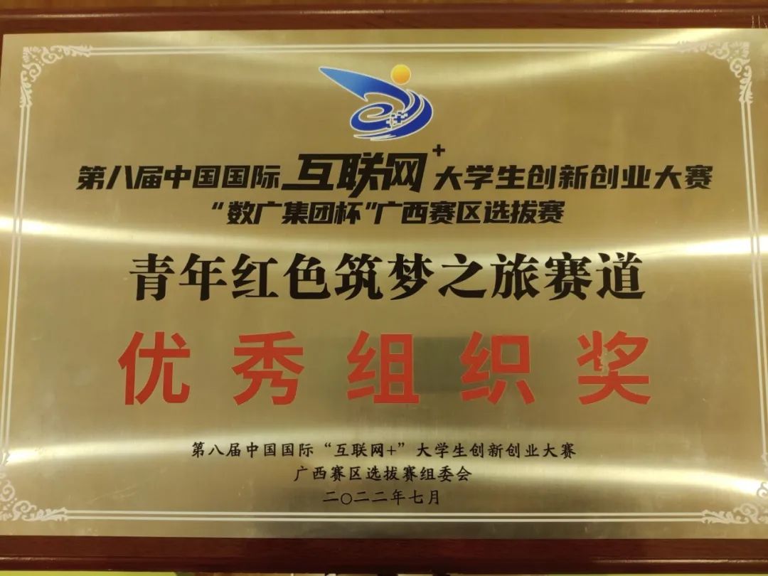 在全国“互联网+”大学生创新创业大赛中,获1金3银14铜,在广西全国“互联网+”大学生创新创业大赛红旅赛道获5金6银34铜、优秀组织奖2次
