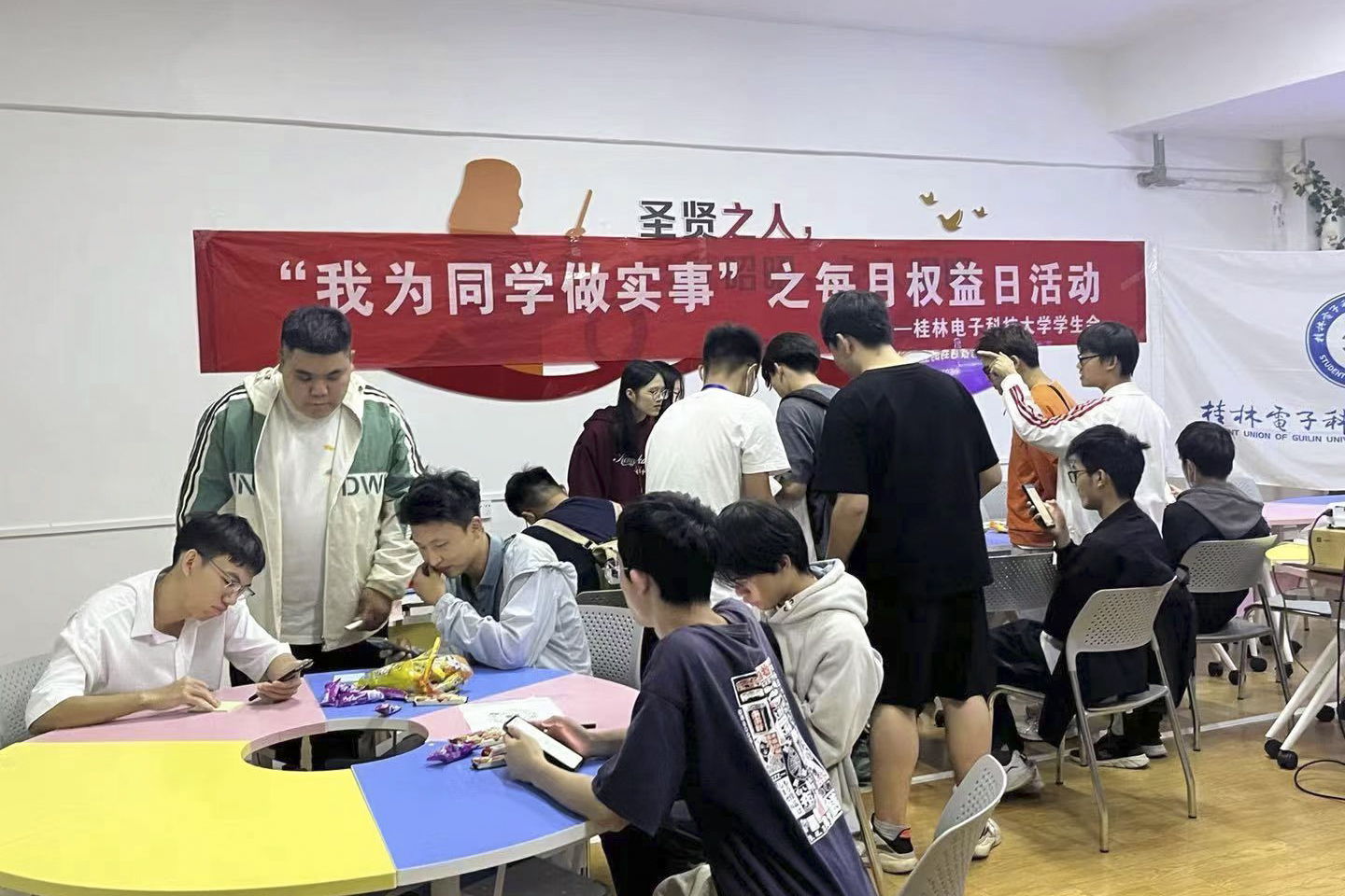 桂林电子科技大学学生会“我为同学做实事”系列活动于11月正式启动。“我为同学做实事”每月权益日首场活动于11月15日在学生公寓D区26栋103室举行,活动主题为“和谐网络你我共享,电信诈骗你我共防”,校团委副书记王辉参加活动。