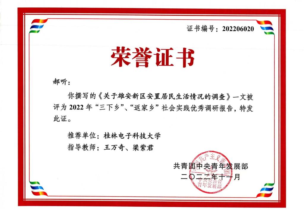 近日,共青团中央公布了2022年“三下乡”、“返家乡”社会实践全国优秀调研报告获奖名单,我校机电工程学院2020级学生郝听撰写的调研报告《关于雄安新区安置居民生活情况的调查》(指导老师:王万奇、梁紫君)成功入选,是广西高校唯一入选作品(全国共100个),同时,该作品还荣获了“镜头中的三下乡”全国优秀视频团队。这是继学校团委获得2022年全国“三下乡”社会实践优秀组织奖后又斩获的2个社会实践国家级奖项。