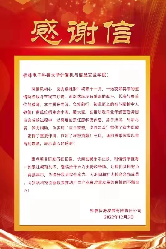 近日,桂林长海发展有限责任公司给我校发来感谢信,对我校计算机与信息安全学院师生在桂林市疫情防控工作中提供的技术支持、保障公司全年经营任务圆满完成,以实际行动展示勇于担当、尽职尽责、倾力相助的精神表示崇高敬意和衷心感谢。