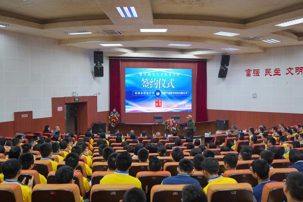 3月3日上午,桂电中学与杭州学盛教育科技有限公司在金鸡岭校区三教一楼报告厅举行合作培养数学拔尖人才签约仪式。桂林市教育局党组成员、副局长文泽鸿,桂电中学校长彭剑波、党委书记杨剑,杭州学盛教育科技有限公司校长冯定应、边红平,桂电中学相关师生代表等参加签约仪式。