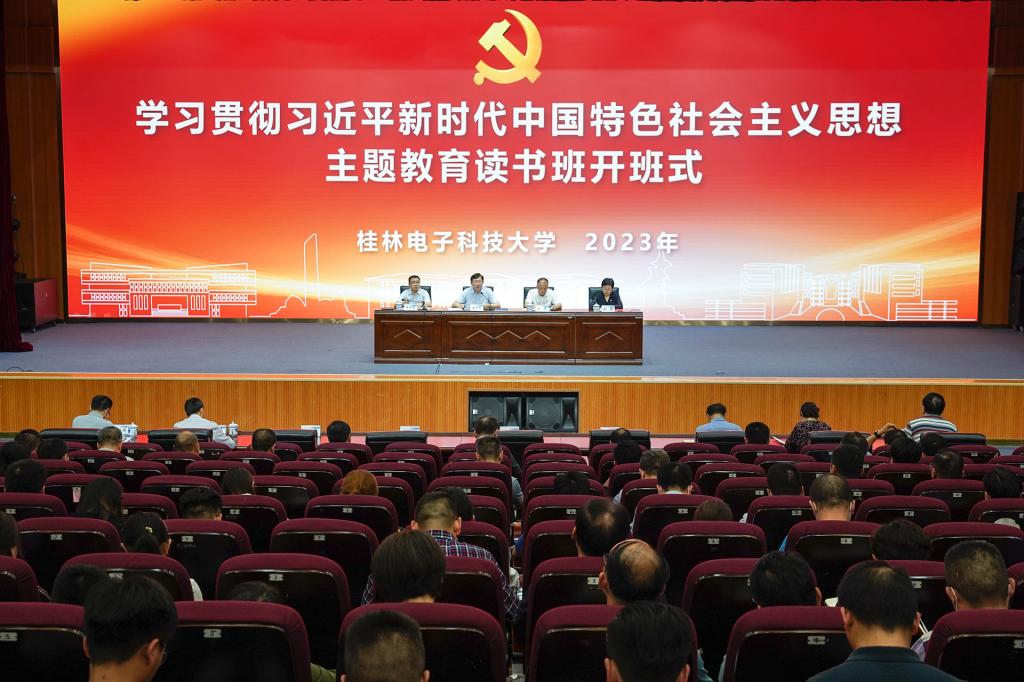 5月4日,我校学习贯彻习近平新时代中国特色社会主义思想主题教育读书班开班式在花江校区会议中心大礼堂举行。自治区党委主题教育第十三巡回指导组副组长、广西师范大学党委副书记赵铁,巡回指导组成员、百色干部学院邓小平理论研究中心主任黄珑到会指导;全体在校校领导、全体中层领导干部、马克思主义学院全体教师、全体辅导员、机关党委全体党员参加开班式。校党委副书记、校长徐华蕊主持开班式。