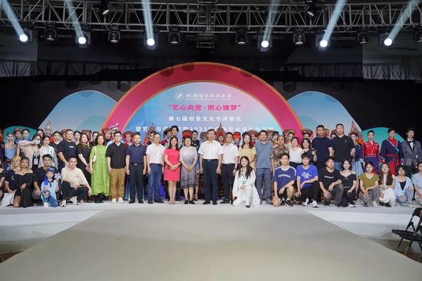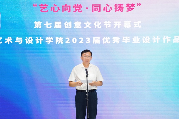 6月19日晚,我校第七届创意文化节开幕式暨艺术与设计学院2023届优秀毕业设计作品展在花江校区大学生活动中心演艺厅举行。校党委书记唐平秋、党委副书记聂慧,全州县委常委马文吉,学校党委宣传部/融媒体中心、党委统战部、学生工作部(处)、校团委、教务处、艺术与设计学院等部门领导和师生代表参加。
