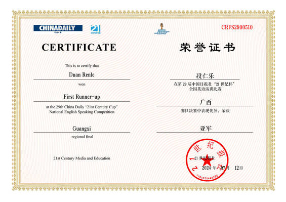 我校信息与通信学院学生段仁乐获得第29届“21世纪杯”全国英语演讲比赛广西赛区亚军