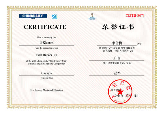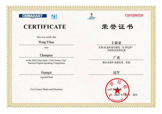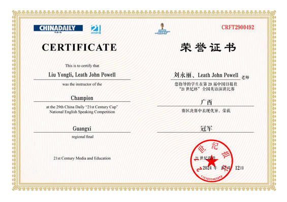 近日,由中国日报社主办的第29届“21世纪杯”全国英语演讲比赛广西赛区决赛落下帷幕。我校外国语学院学生王毅豪、信息与通信学院学生段仁乐分别荣获冠军和亚军,并将代表广西赛区参加全国总决赛。团队指导教师刘永丽、Powell、李倩梅获得“优秀指导教师”称号。