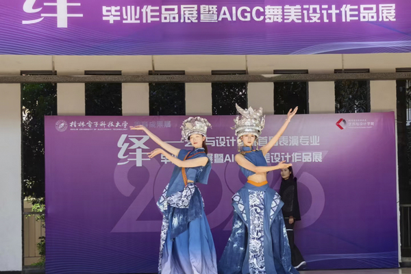 展览由学院2025届31名表演专业毕业生精心创作完成,围绕“绎”这一主题,融合传统与现代、艺术与科技,展示了服装设计与舞台美术的创新成果。活动分为静态展区与动态展演两部分,其中动态走秀生动演绎了服装背后的设计理念与情感表达,静态展区展示服装设计与基于AIGC舞美设计作品。展览时间持续到10月份,地点在41教一区一楼。