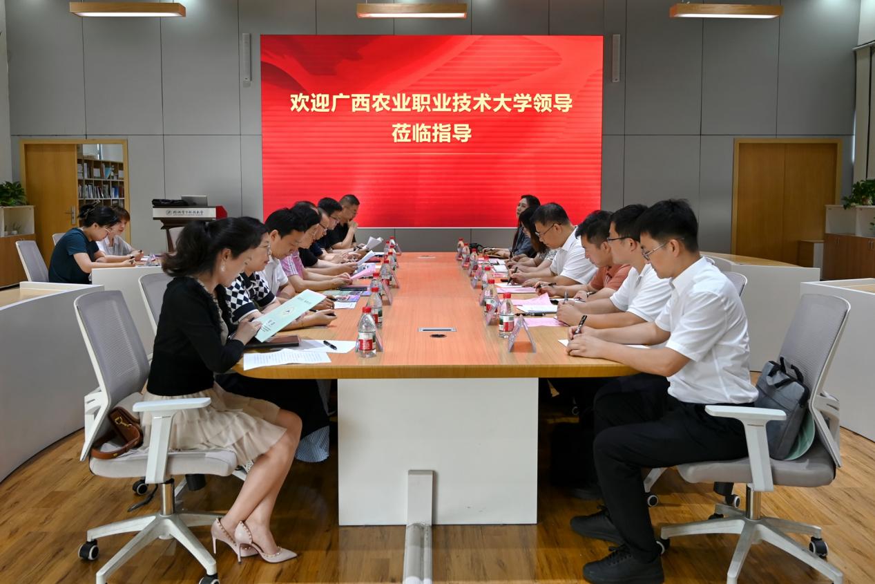6月12日,广西农业职业技术大学党委副书记陈信存带队来校交流。校党委副书记聂慧接待陈信存一行,双方在花江校区融媒体中心进行座谈交流,我校相关职能部门、单位人员参加。