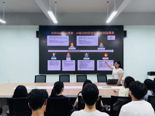 座谈会上,曾艳携手数字3D主持人惊艳亮相,让同学们直观地感受AI的现实应用魅力。她以“AIGC:利用人工智能技术生成内容的技术和方法”为题展开讲解,内容涉及AIGC与软件工程3.0的紧密关联、AIGC在软件开发中的多元应用以及对IT行业生态的重塑作用,并对未来发展进行展望,剖析其中蕴含的机遇。最后,曾艳向学院捐赠了《持续交付2.0》《敏捷漂流记——实践避坑指南》等图书,学院院长张敬伟代表学院接收捐赠图书。