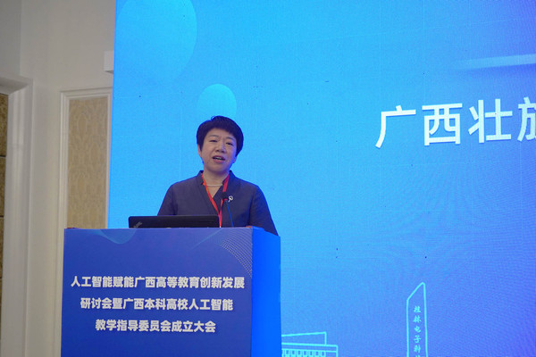 张旭凤在致辞中指出,人工智能的蓬勃发展对高等教育提出了新的要求和挑战。“十四五”以来,自治区坚持扩量提质并举,不断深化高等教育综合改革,高等教育取得明显成效,事业发展整体迈上了新台阶,目前广西高校已初步建立人工智能教育体系,但仍存在发展挑战,要高度重视人工智能对高等教育的深刻影响,重设人才培养目标、重塑教育内容、重构教学范式,积极推动人工智能和教育深度融合,抢抓发展机遇,使人工智能成为推动广西高等教育高质量发展的重要助力。她对加快广西高校人工智能教育发展提出了五点要求:一是要完善人工智能相关学科专业体系;二是要构建人工智能课程体系;三是要打造面向东盟的人工智能人才高地;四是要加强“人工智能+高等教育”场景建设;五是要凝聚人工智能人才培养合力。她宣读了广西本科高校人工智能教学指导委员会委员名单,并为教指委名誉主任、主任、副主任委员颁发聘书。