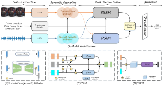 该论文提出了一种名为DiffuFuse的扩散驱动双流融合框架,创新性地将扩散去噪模型引入多模态情感分析任务,实现了对视觉与声学特征中共享语义与私有语义的精细化解耦,并设计了共享语义增强模块(SSEM)与私有语义注入模块(PSIM)构成的双流融合策略。该方法能够动态划定跨模态语义边界,有效缓解信息冗余与语义冲突问题,同时通过正交融合机制消除冗余文本信息,显著提升融合表征的判别力。