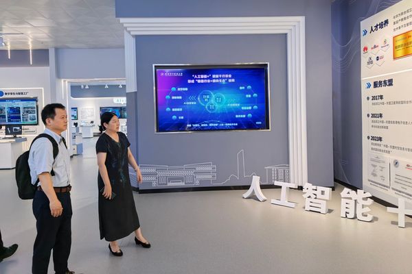期间,胡事民参观了学校人工智能科技成果展厅,并就相关领域的前沿技术和发展趋势进行了深入交流。