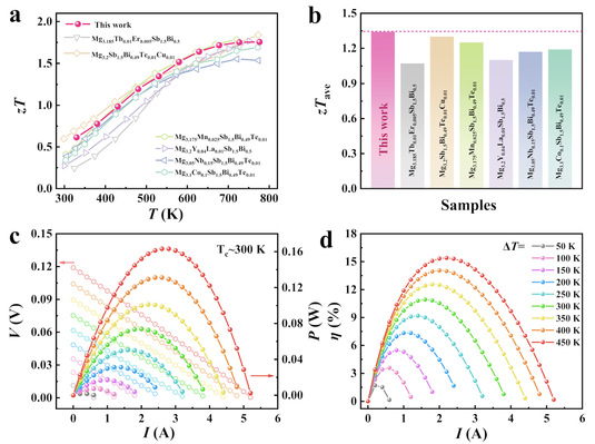 在Mg3(Sb,Bi)2基材料中,低温下的电荷载流子输运通常受晶界散射主导,在晶界处产生载流子束缚与迁移受阻等现象(热激活的导电行为),严重制约了材料的热电性能。研究团队基于电子功函数理论,策略性地在基体材料中引入电子功函数较小的惰性纳米金属颗粒,在金属-半导体界面形成反阻挡层,从而有效抑制了热激活的导电行为,为提升该类材料体系热电性能提供了新思路。基于电子功函数原理,研究团队在多晶n型Mg3(Sb,Bi)2基体中理性引入了W纳米颗粒。W作为一种高效的电子传输介质,激活了晶界处的束缚电荷提升了电子浓度,此外能够促进电子在界面间的迁移,大幅增强了电子迁移率,有效降低晶界电阻,进而在473-573 K温区内获得了高达24μW cm-1K-2的功率因子。此外,引入的W纳米颗粒引发了强烈的声子散射,导致热导率降低。由于电子和声子的协同优化作用,材料在整个测试温区(323-773 K)内实现了1.34的优异平均zT,理论预测的单腿器件效率可达15.4%。该成果展现了Mg3(Sb,Bi)2基材料热电应用中的巨大潜力,为材料性能的提升和应用开辟了新思路。