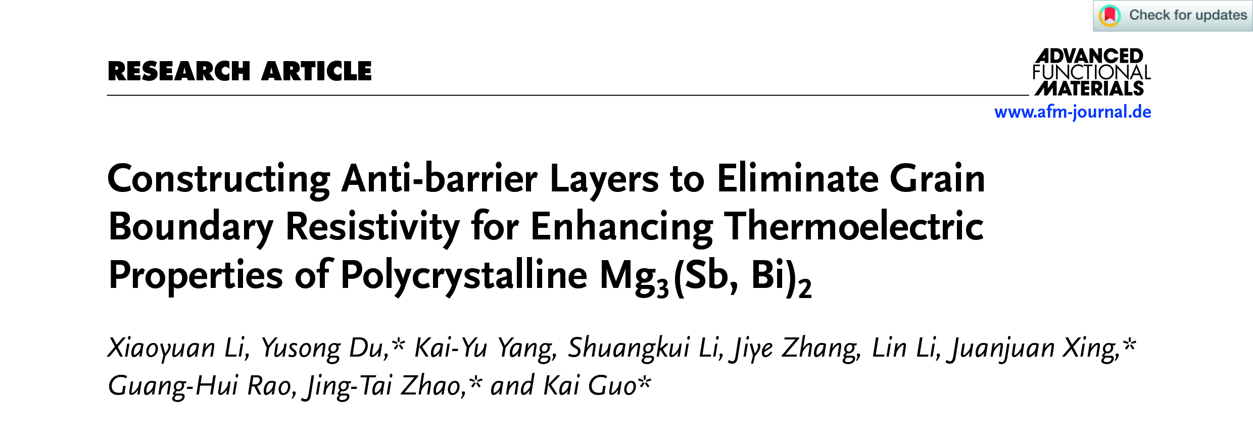 近日,我校材料科学与工程学院材料学八桂学者团队联合广州大学、上海大学,在Mg3(Sb,Bi)2基材料热电性能优化方面取得新的进展。研究成果以“ConstructingAnti-barrierLayers toEliminateGrainBoundaryResistivity forEnhancingThermoelectricProperties ofPolycrystallineMg3(Sb,Bi)2”为题发表于材料类Top期刊《Advanced Functional Materials》(影响因子19,中科院分区1区),文章DOI: 10.1002/adfm.202512586。材料科学与工程学院硕士研究生李晓媛为第一作者,赵景泰教授、杜玉松副教授,广州大学郭凯教授与上海大学邢娟娟副研究员为共同通讯作者,我校为论文的第一完成单位。