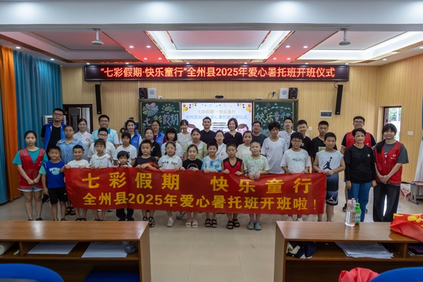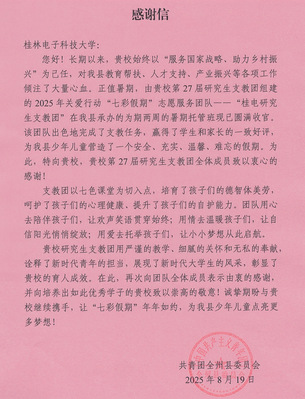 8月4日至15日,我校第27届研究生支教团赴桂林市全州县开展“七彩假期快乐童行”2025年爱心暑托班活动。活动累计服务当地少年儿童1300余人次,获得主办单位及学生家长的一致好评,共青团全州县委员会特向我校发来感谢信。