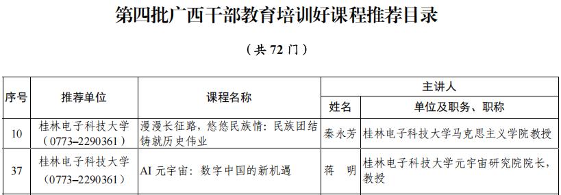 近日,自治区党委组织部下发《关于印发第四批广西干部教育培训好课程推荐目录的通知》(桂组通字〔2025〕35号),经专家评审,全区共有72门课程被评为第四批广西干部教育培训好课程。我校马克思主义学院秦永芳教授主讲的《漫漫长征路,悠悠民族情:民族团结铸就历史伟业》和计算机与信息安全学院蒋明教授主讲的《AI元宇宙:数字中国的新机遇》两门课程成功入选。至此,我校累计已有5门课程入选自治区干部教育培训好课程。