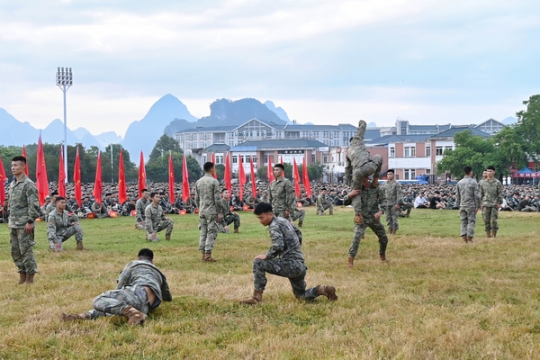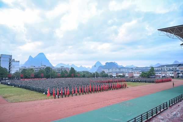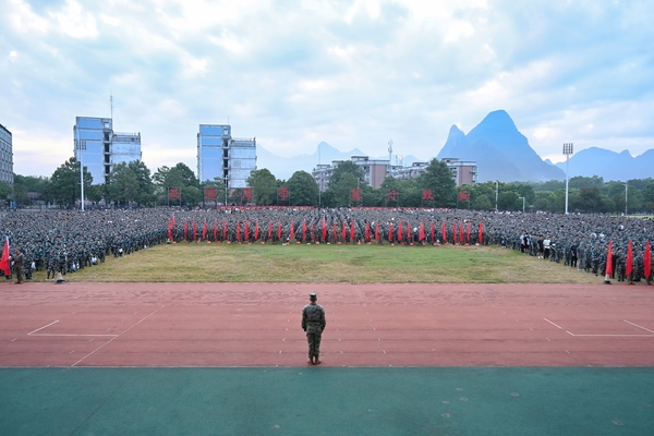 大会在庄严的国歌声中拉开帷幕,张文涛作动员讲话。他指出,军训,既是贯彻落实国家国防政策、服务国防现代化建设的具体举措,也是加强大学生国防教育、培养社会主义建设者和接班人的内在要求。学校历来高度重视军训工作,始终把军训作为人才培养的重要环节,作为激发大学生爱国热情、奋斗意志、优良作风的重要抓手。军训对于大学新生的意义,不仅仅是简单的体能训练,更是不可或缺的爱国主义大课。希望同学们淬炼钢铁意志,展现桂电人的奋斗本色;锻造过硬作风,展现桂电人的团队精神;增强爱国热情,展现桂电人的家国情怀。