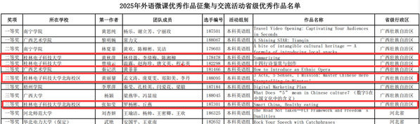 近日,2025年外语微课优秀作品征集与交流活动公布了省级优秀作品名单。我校4支团队的作品取得佳绩,外国语学院黄秋萍团队(成员:林佳盈、李倩梅、陈湘柳)和曾瑞云团队(成员:温露、赵海珍、唐文英、程志英)荣获二等奖,北海校区黄丽鋆团队(成员:孟文涛、庞夏雯、郑阳美、李丹)和张如莹团队(成员:罗杨彬、丘燕)荣获三等奖。