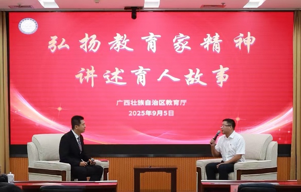 为庆祝第41个教师节,9月5日,由自治区教育厅主办的“弘扬教育家精神,讲述育人故事”活动在南宁举行。活动采取线上线下结合的方式进行,主会场设在自治区教育厅会议室,我校设视频分会场。我校信息与通信学院李晓欢教授受邀在主会场登台讲述育人故事。校党委常委、副校长潘开林,相关职能部门负责人和二级教学单位教师代表线上参加。