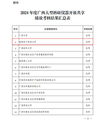 近日,自治区科技厅发布《关于公布2024年度广西大型科研仪器开放共享绩效考核结果的通知》(桂科发〔2025〕349号),经综合考核评估,我校再次获评“优秀”等次。此次考核共有包括高校、科研院所、检测机构等110家单位参加,其中11家单位获得“优秀”。