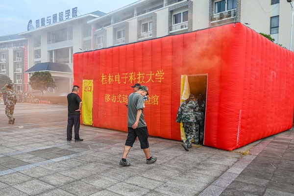 活动以现场同步直播的方式开展消防疏散演练。演练设定为:花江校区信息与通信学院大楼五楼发生模拟宿舍场景火灾,保卫处接警后,马上派队员到现场使用室内消防栓用水带接水进行了灭火;紧接着三楼实验室发生火灾,火势较大,楼上有多人被困,急需救援。桂林市七星消防救援大队出动3辆消防车,10余名消防指战员火速赶赴现场处置。参加演练的同学们在消防指战员及保卫处人员的指挥下,用湿毛巾紧捂口鼻,按照预定的逃生路线,有序疏散到指定安全地点。整个演练过程紧张有序,灭火行动组、疏散引导组、安全救护组密切配合、反应迅速,达到了预期效果。随后,消防救援队伍指战员结合实际案例,向同学们科谱电动车火灾、火场逃生、灭火器使用方法等消防常识,全体新生进行了消防安全宣誓,学生代表在消防救援队伍指战员的指导下使用了灭火器材及移动模拟逃生帐篷。唐峰对此次活动进行了点评。