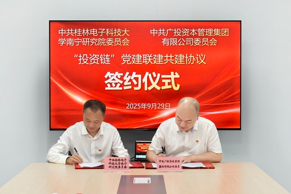 黄少波对任洪正一行表示欢迎,介绍了学院在人工智能领域的科研布局、人才培养及产学研合作情况,希望双方以党建联建为纽带,在产业投资、人才引进、技术转化等方面深化合作,共同服务广西人工智能产业发展。任洪正介绍了广投资本在资本运作、产业布局、投资链建设及党建方面的实践优势,希望与广西人工智能学院建立常态化合作机制,实现前沿技术与资本市场的精准对接,推动科技创新与产业升级深度融合。双方在座谈会上签订党建联建协议,今后将在党建方面联建联学,以高质量党建促进业务融合发展。