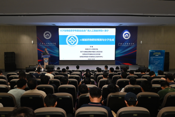 活动期间,与会人员参观了广西人工智能学院成果展厅,深入了解学院在学科建设、科研平台、人才培养及成果转化等方面的进展。中南大学计算机学院院长李敏教授作题为“人工智能赋能生物与药物研发”的开场报告,系统介绍其在药物靶标识别、亲和力预测与分子生成等方面的智能预测新方法,展现了AI技术在药物研发中的前沿应用与潜力。军事医学研究院陈河兵副研究员、安徽大学苏延森教授、昆明理工大学彭玮教授分别围绕“肿瘤三维基因组智能解析”“抗寄生虫药物发现的智能计算方法”及“基于迁移学习的抗癌药物反应预测”等前沿方向作学术分享。