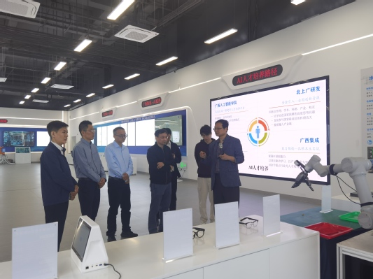 调研期间,杨巨成介绍了学院在“人才培养—技术研发—产业赋能—国际合作—生态构建”方面形成的完整闭环体系,讲解了广西人工智能学院在人工智能领域的资源整合进展、成果转化成效与未来发展规划。
