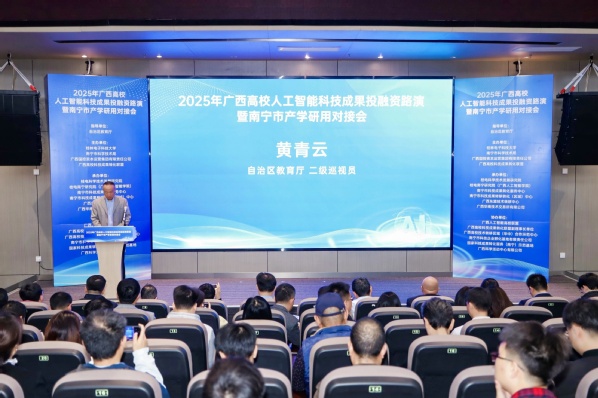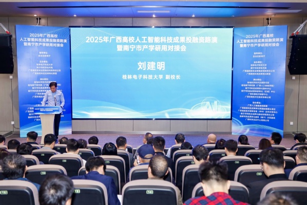12月3日,2025年广西高校人工智能科技成果投融资路演暨南宁市产学研用对接会在广西人工智能学院举行。本次会议由我校(广西高校科技成果转化联盟理事长单位)联合广西国控集团、南宁市科技局共同主办。广西壮族自治区教育厅巡视员黄青云,我校副校长刘建明,以及全区各高校、企业、投融资机构及有关单位代表共200余人参加。