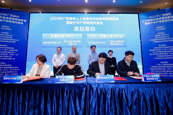 签约仪式上,广西大学、我校、广西民族大学及南宁职业技术大学分别与广西飞创信息科技有限公司、南宁纹析生物科技有限公司、广西云策科技有限公司、广西巨大教育科技集团有限公司签署技术开发或产学研合作协议,标志着高校人工智能科技成果与市场实现精准对接,为后续深度合作奠定基础。