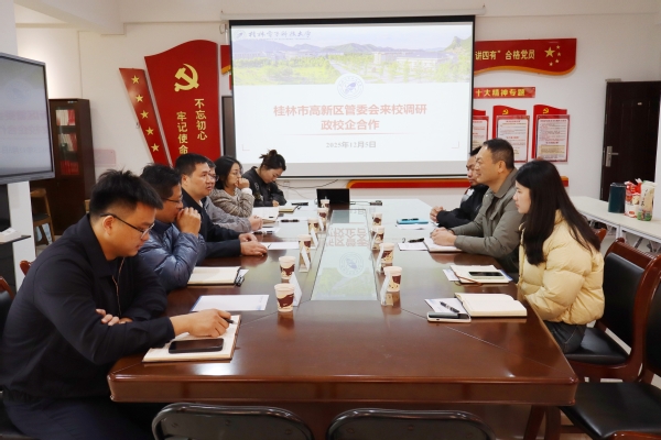 12月5日,桂林市高新区管委会副主任李剑带队来校,就深化政校企合作、推进招商引资、强化人才支撑及成果转化等工作进行座谈。我校校友办公室副主任肖亮接待李剑一行。