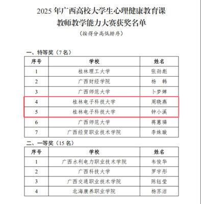 近日,广西壮族自治区教育厅公布了2025年广西高校大学生心理健康教育课教师教学能力大赛获奖名单。我校参赛教师周晓燕、钟小溪均荣获大赛特等奖。