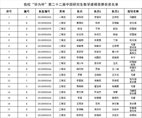 12月7日,“华为杯”第二十二届中国研究生数学建模竞赛颁奖大会在中国矿业大学举行。经过激烈角逐,我校研究生团队荣获全国一等奖1项、二等奖9项、三等奖8项,另有47支参赛队伍获得成功参与奖,创下我校参赛以来的最好成绩。同时,我校数学与计算科学学院副院长祝光湖荣获赛事“先进个人”称号。
