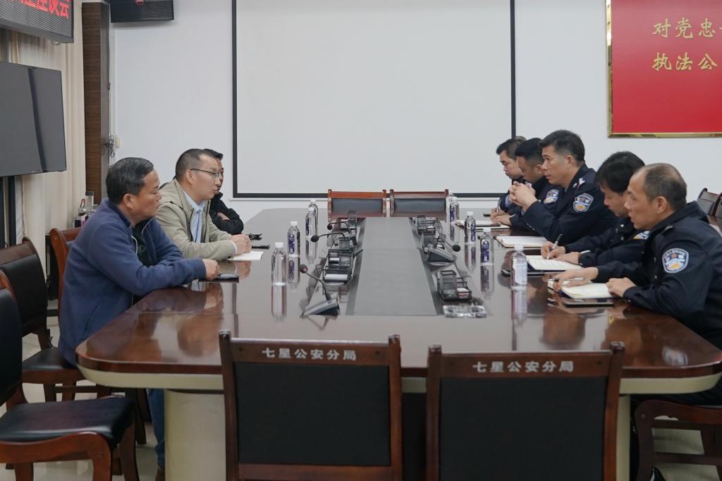 为进一步夯实校警协作机制,凝聚“平安校园”建设合力,3月17日下午,保卫处领导班子一行3人前往桂林市公安局七星分局开展校园安全交流座谈。桂林市七星区副区长、七星分局党委书记、局长蒋德龙,七星分局党委委员、副局长邓佳,朝阳派出所、治安大队、反诈中心等相关部门负责人参加座谈。